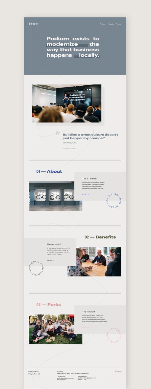 Before they rebranded, Podium’s brand was comprised of a muted color palette, mega-wide primary font, and collection of subtle patterns and simple illustrations. During my short time there, I designed the internal website, digital flyers, e-book templates, pillar wraps, and many, many sales sheets. We also did branding exercises in groups to explore ways to push and evolve the brand. My exploration is included here—showcasing brighter colors, more dynamic typography, and punchier statements.